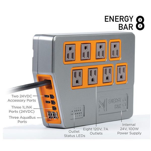 This Energy Bar 832 was redesigned from the ground up. Not only does it have eight 120V AC outlets, but it includes an internal 100W 24VDC power supply as well. That power supply feeds three built-in 1LINK ports as well as two 24VDC accessory ports. Each individual outlet has power monitoring and there are individual LED indicators for each outlet.